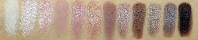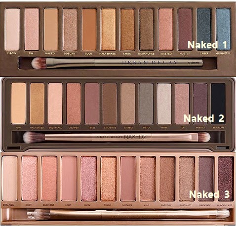 ก่อนอื่นมาดูภาพเปรียบเทียบพาเลท Naked ทั้ง 3 ตัวกันก่อนนะคะ แต่ละพาเลทจะมีอยู่ 12 สี จะเห็นได้ว่าสีจากทั้งสามพาเลทดูจะคล้ายๆ กัน แต่หากเราพิจารณาดูดีแล้ว เราจะเห็นความแตกต่างทั้งสามพาเลท แบ่งออกเป็น 3 โทนสีด้วยกัน นั่นคือ Naked1 สีอบอุ่นน้ำตาลบรอนซ์ทอง Naked2 โทนเย็นเทาๆ หรือ/ Naked3 โทนหวานชมพู โดยจะขอเปรียบเทียบให้เห็นรายละเอียดทีละส่วน ดังนี้ค่ะ